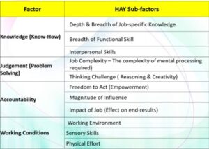 The HAY system uses four Factors that are broken down into 11 sub-factors as shown below and the evaluation of a job involves the analysis of that job using a job description for the position and input from the manager to whom the role reports to determine the extent to which the various sub-factors exists in the role being evaluated.